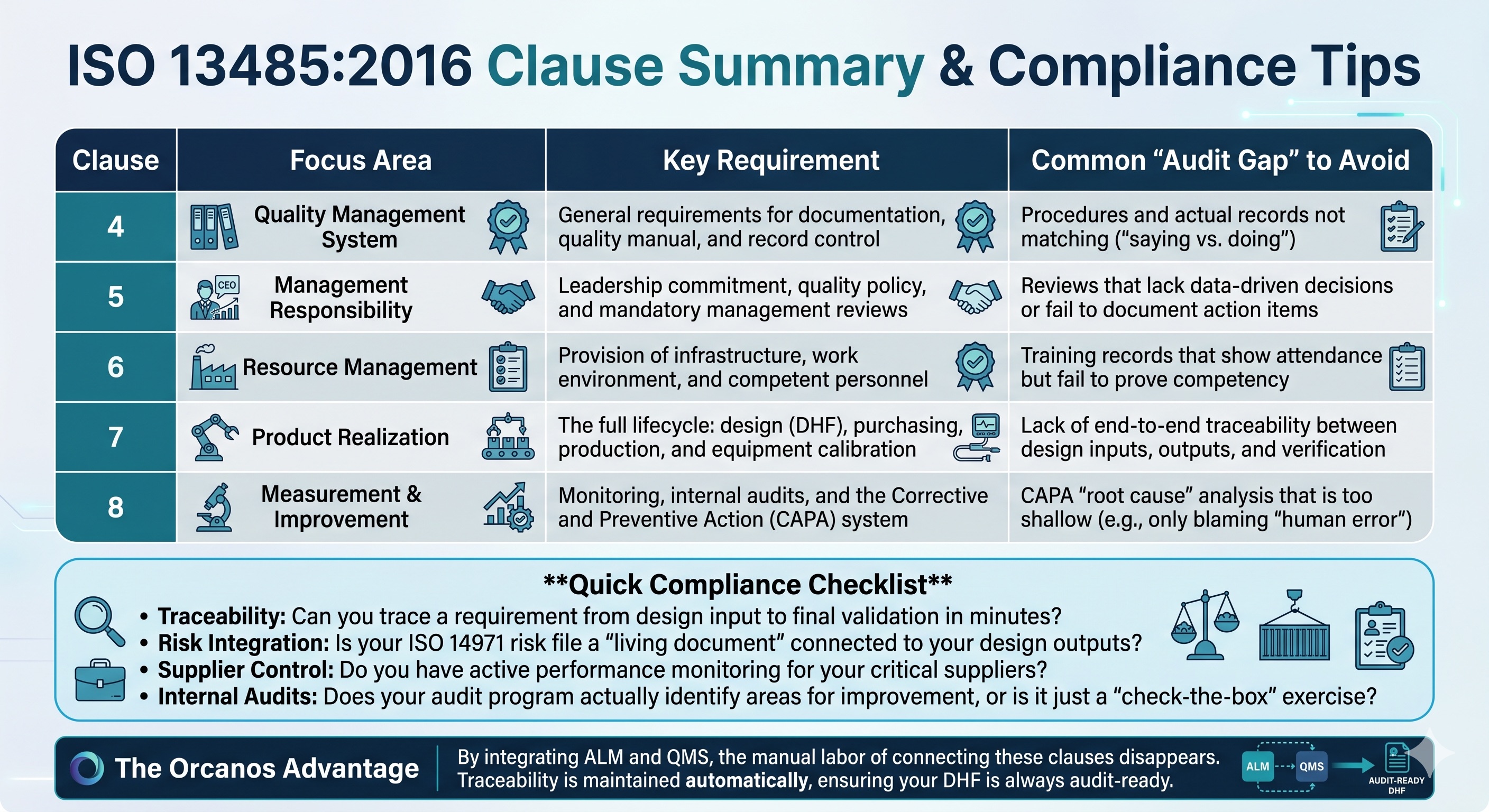 Orcanos addresses this directly by combining ALM and QMS functionality in a single platform. Requirements, design controls, risk records, CAPA, and the DHF all live in one environment with a shared data model. The traceability that ISO 13485 Clause 7.3 requires is built into the system structure, not assembled after the fact.